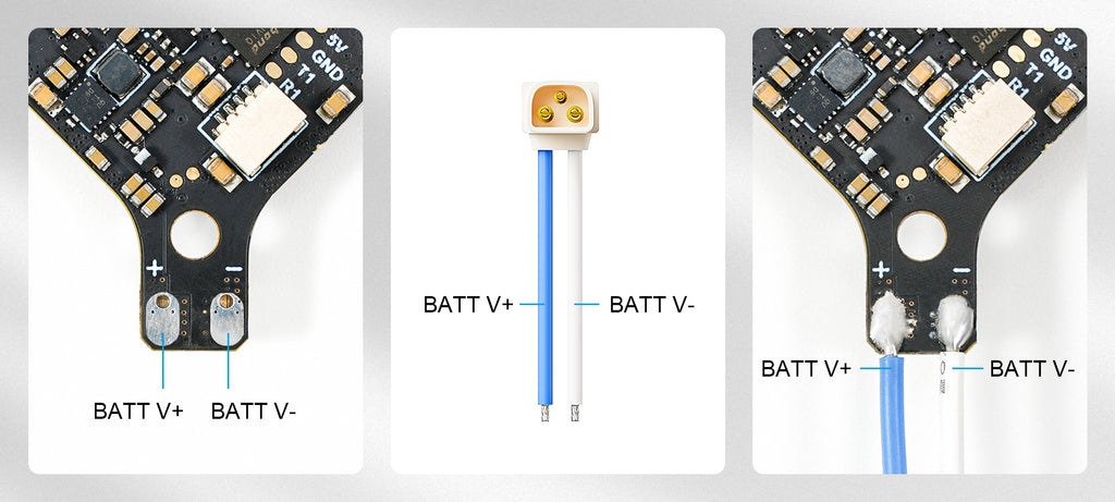 When you resolder your board, please pay attention to the connection method. BT3.0 Cable Pigtail is composed of blue wire and white wire. The blue wire is the positive pole(+), and the white wire is the negative pole(-).
